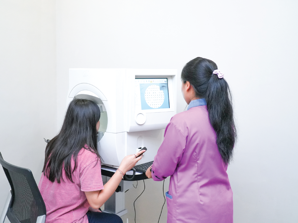 An eye exam involves a series of tests to evaluate vision and check for eye diseases. Our doctors are likely to use various instruments, i.e. shine bright lights at the eyes and request that patients look through an array of lenses. Each test during an eye exam evaluates a different aspect of their vision or eye health.